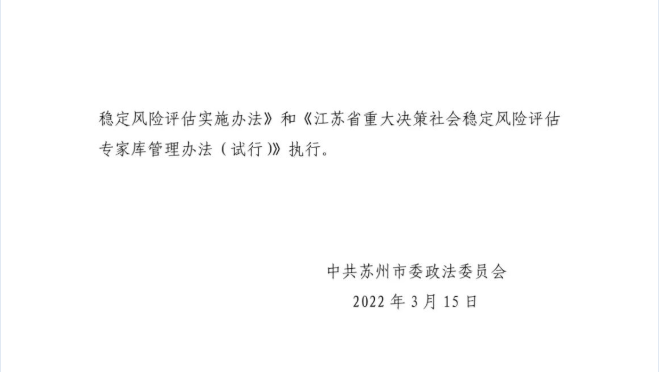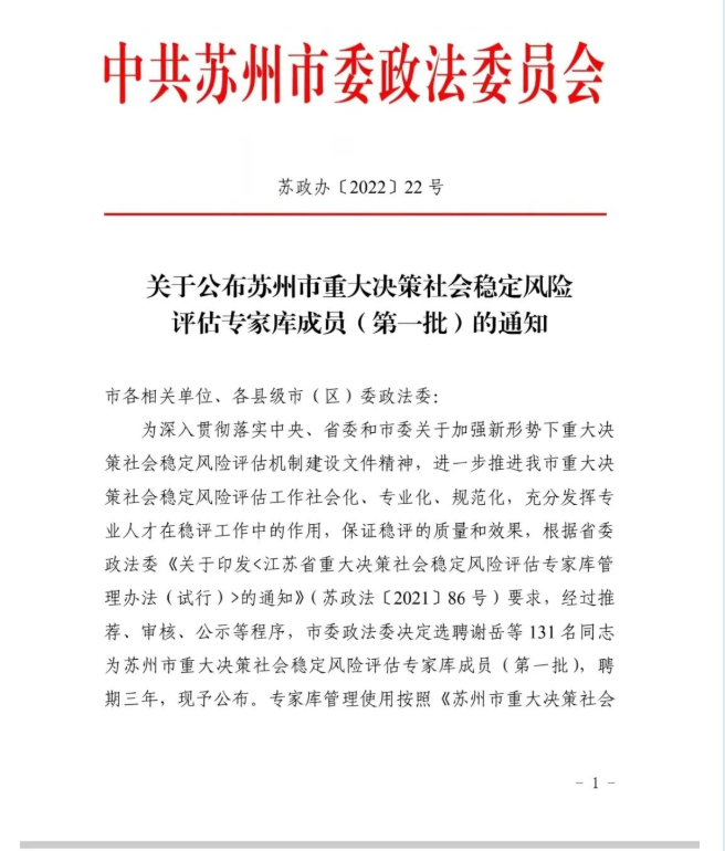 赵胜主任表示,当前疫情反复、自然灾害频发,国内外局势亦愈发复杂,对重大决策的科学性和前瞻性提出了更高的要求,针对重大决策进行社会稳定风险评估具有重要的意义;非常荣幸能够入选第一批苏州市重大决策社会稳定风险评估专家库,我愿将所专、所长充分运用在风险评估工作中,为维护社会稳定贡献力量。